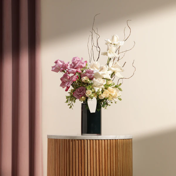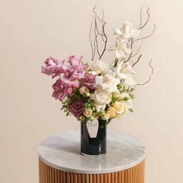 بفرحة التخرج، امنح من تحب لحظة لا تُنسى مع هدية تليق بالنجاح والتفوق. تنسيق زهور فاخر يضم جوري أبيض وجوري بنفسجي وبيبي جوري بلون برتقالي فاتح، منسقة بأناقة داخل مزهرية زجاجية أسطوانية مغلفة بغلاف أسود أنيق، ومزينة بعود تزيين "مبروك التخرج". هذه الهدية القيمة تنطق بالحب والفخر في كل تفصيلة. اشترِ الآن واحتفل معهم بأسلوب يليق بإنجازهم الكبير. اشترِها لمن تحب واصنع ذكرى لا تُنسى.