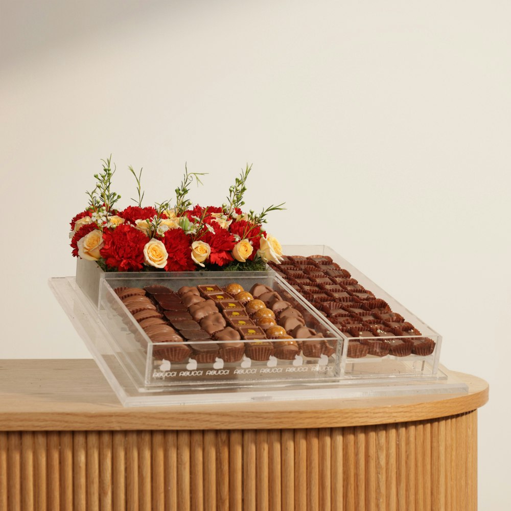 اجعل زيارتك أو تهديتك لأحباءك لحظة استثنائية مع صينية الشوكولاتة الفخمة من أبوتشي، التي تجمع بين الطعم الغني والمظهر الأنيق في قطعة واحدة. تحتوي الصينية على مجموعة متنوعة من قطع الشوكولاتة الفاخرة التي تمنح تجربة تذوق لا تُنسى، لتكون هدية مثالية تبهج من تتلقاها. يزينها تنسيق كلاسيكي من الزهور يعكس الرقة والجمال، حيث تتناغم زهور الكارنيشن الحمراء مع ورود البيبي جوري البرتقالي الفاتح وزهور الشمع البيضاء لتضفي لمسة أناقة وفخامة على الهدية. تصميم الصندوق المتقن يجعله الخيار الأمثل لإرسال التهاني والمفاجآت في المناسبات الخاصة، أو لتقديمه كهدية راقية عند زيارة أحبائك، ليترك أثرًا جميلًا ويعبّر عن الذوق الرفيع. امنحهم لحظة من السعادة والجمال مع صينية أبوتشي الفاخرة التي تجمع بين الرقة والطعم الرائع في تجربة لا تُنسى.