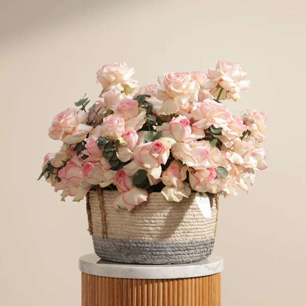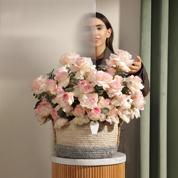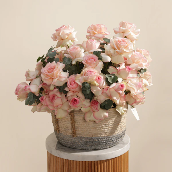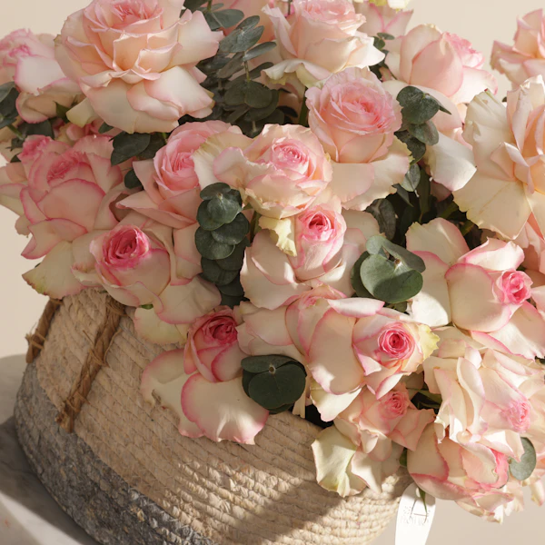 باقة زهور راقية تنسج تفاصيلها من الجوري إسبرانس الساحر بلونه الوردي الممزوج بحواف كريمية ناعمة، بتدرجات تنبض بالرقة والأنوثة. تنسدل الزهور بأناقة داخل سلة منسوجة يدوياً تضفي لمسة طبيعية ودافئة على التنسيق. تكتمل الباقة بأوراق الأوكالبتوس الخضراء المنعشة التي تضيف توازناً بصرياً ولمسة من الانتعاش، ما يجعلها خياراً مثالياً لمن يبحث عن الجمال الهادئ المتناغم. سواء كُرمت بها أم أُهديت بها، تحمل هذه الباقة رسالة حب وامتنان واهتمام، وتناسب مختلف المناسبات من تهنئة رقيقة إلى تعبير عن مشاعر عميقة. بتصميمها المتناغم، تشعرك وكأنها قطعة من حديقة حالمة نُسجت لتلامس القلب وتترك أثراً لا يُنسى.