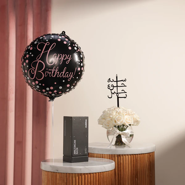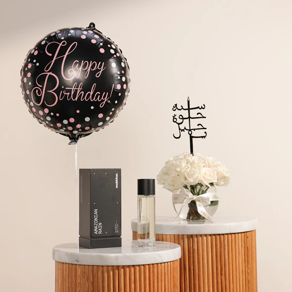 احتفل بأسلوب راقٍ مع هدية لا تُنسى تجمع بين عطر أمازونيان رين من مبخر، بعبيره الدافئ ولمساته الذهبية، ومزهرية جوري أبيض تنبض بالنقاء، وبالون عيد ميلاد يضفي روح الفرح، وعود تزيين يحمل عبارة "سنة حلوة يا جميل". باقة متكاملة تنطق حبًا وأناقة، مثالية لمن يستحقون الاحتفال من القلب، بأسلوب مميز وفاخر يترك أثرًا يدوم.